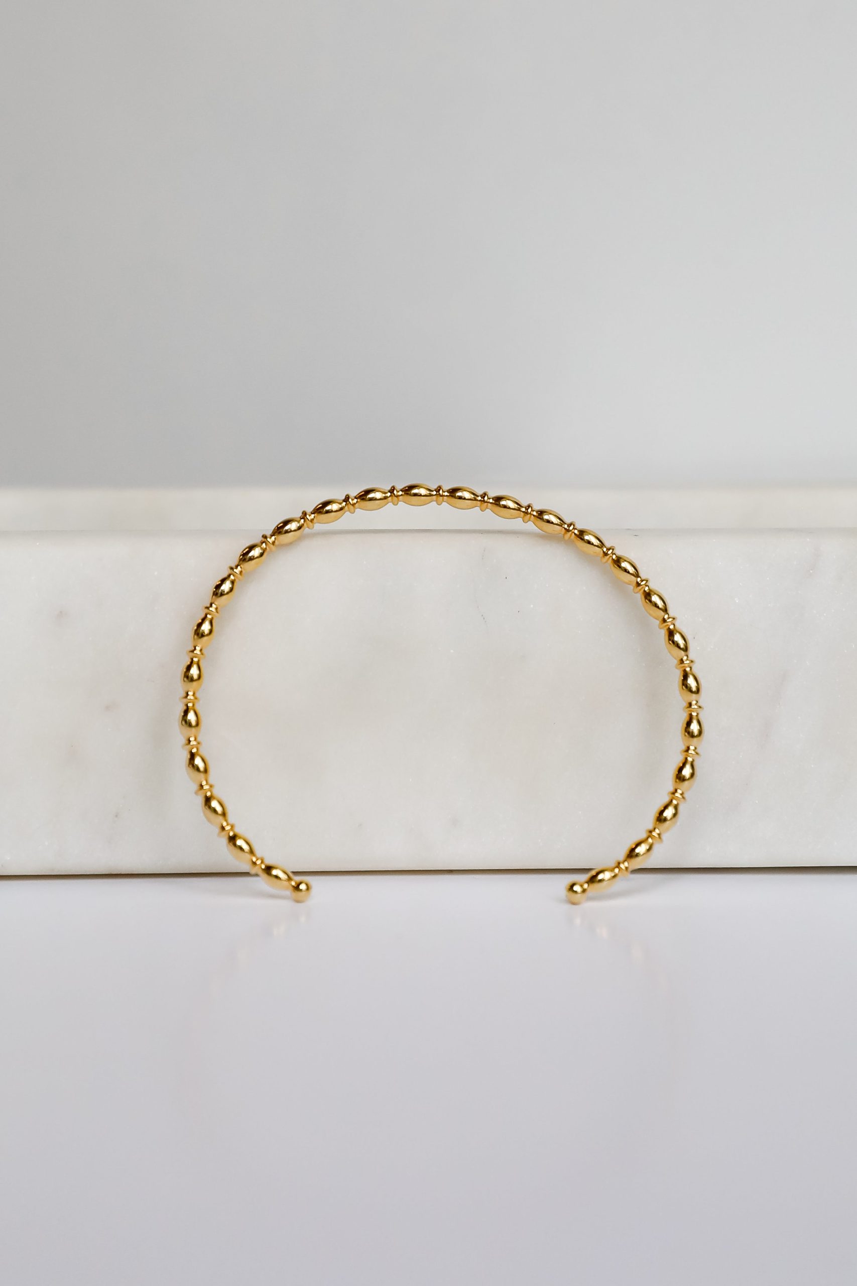 Elevate your bracelet collection with the classy addition of the Andrea Gold Cuff Bracelet! This chic gold bracelet has a classic cuff design. Wear it on its own or stacked with other bracelets to instantly upgrade your look! Gold Plated CuffOne Size | Diameter 2.5”
